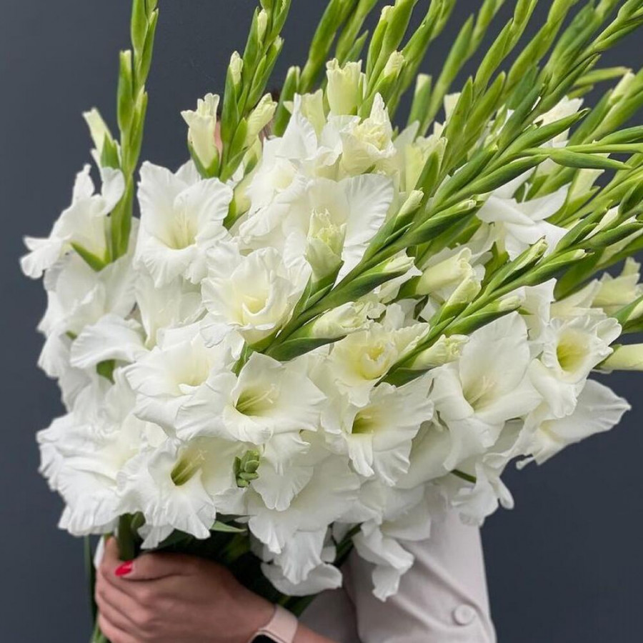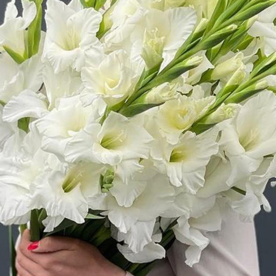 На фото букет из 19 белых гладиолусов. В составе: гладиолус 19 шт, атласная лента 1 шт, . Все цветы свежие и ароматные, букет красиво оформлен и отлично подходит для подарка. Доступна доставка цветов или самовывоз.