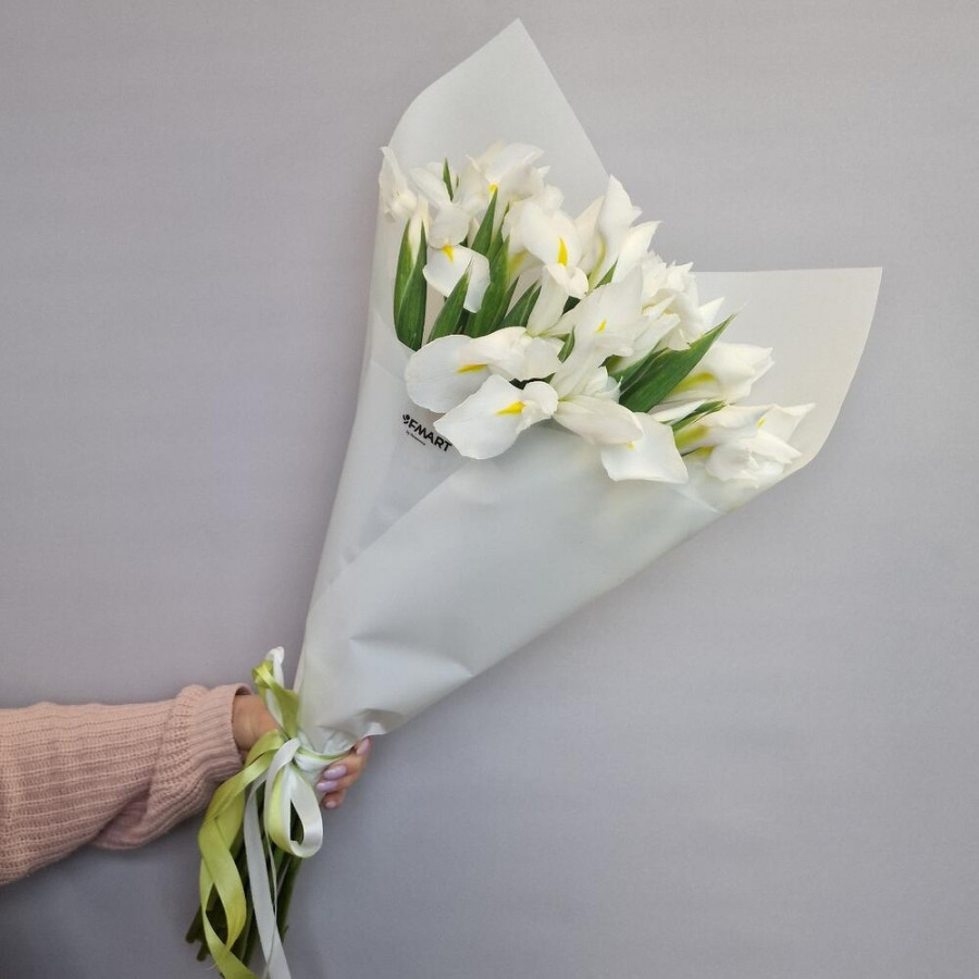 На фото букет 19 белых ирисов. В составе: ирис 19 шт, дизайнерская упаковка 1 шт, атласная лента 1 шт, . Все цветы свежие и ароматные, букет красиво оформлен и отлично подходит для подарка. Доступна доставка цветов или самовывоз.