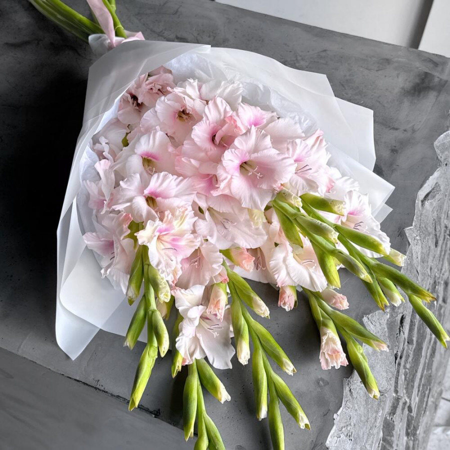 На фото букет из 9 розовых гладиолусов. В составе: гладиолус 9 шт, дизайнерская упаковка 1 шт, . Все цветы свежие и ароматные, букет красиво оформлен и отлично подходит для подарка. Доступна доставка цветов или самовывоз.