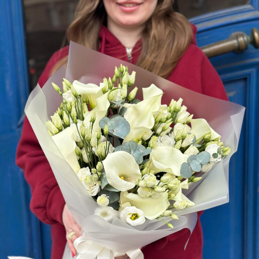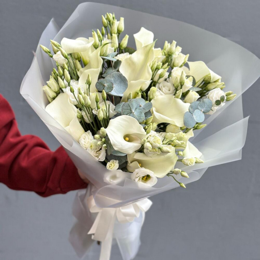 На фото букет из белых калл и эустом. В составе: эустома (лизиантус) 12 шт, калла 7 шт, дизайнерская упаковка 1 шт, атласная лента 1 шт, . Все цветы свежие и ароматные, букет красиво оформлен и отлично подходит для подарка. Доступна доставка цветов или самовывоз.
