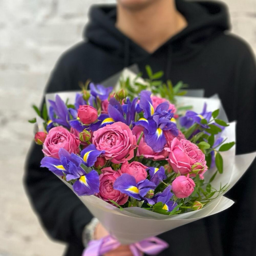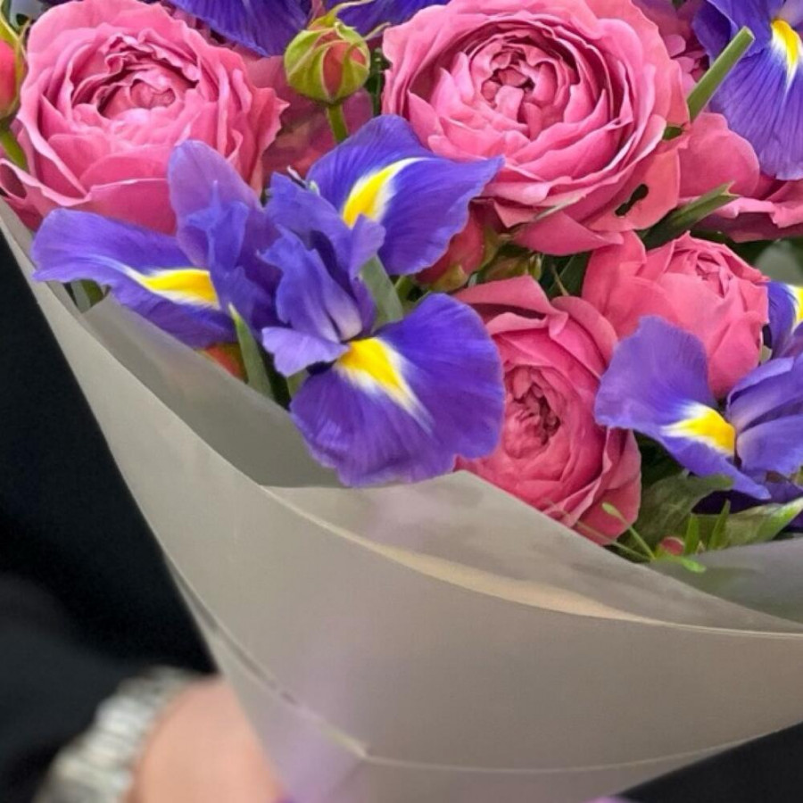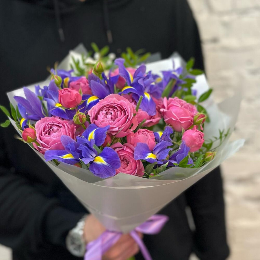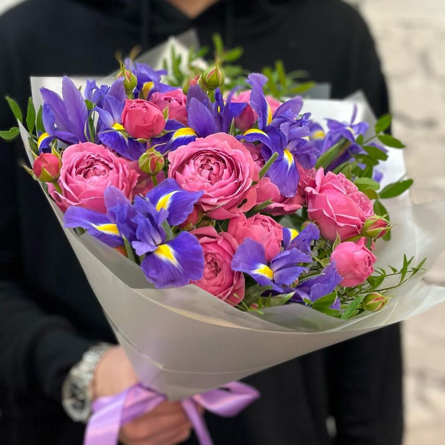 Букет из розовых пионовидных роз и синих ирисов в Свободном
