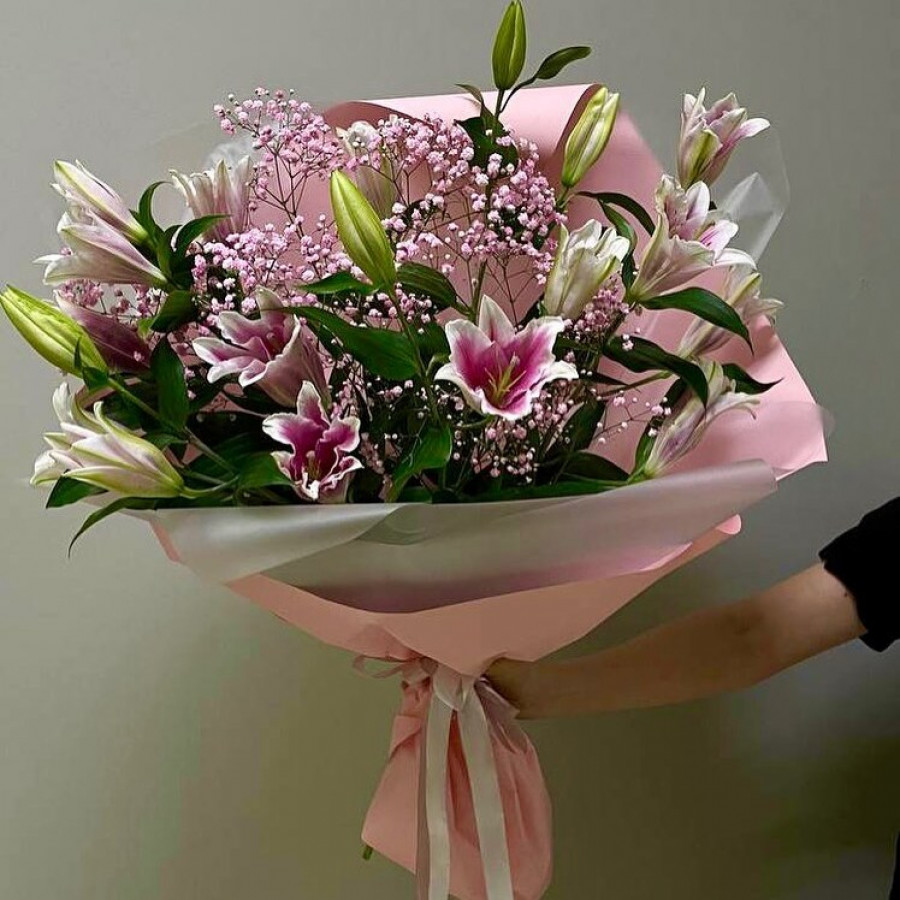 Букет из розовой лилий и гипсофилы