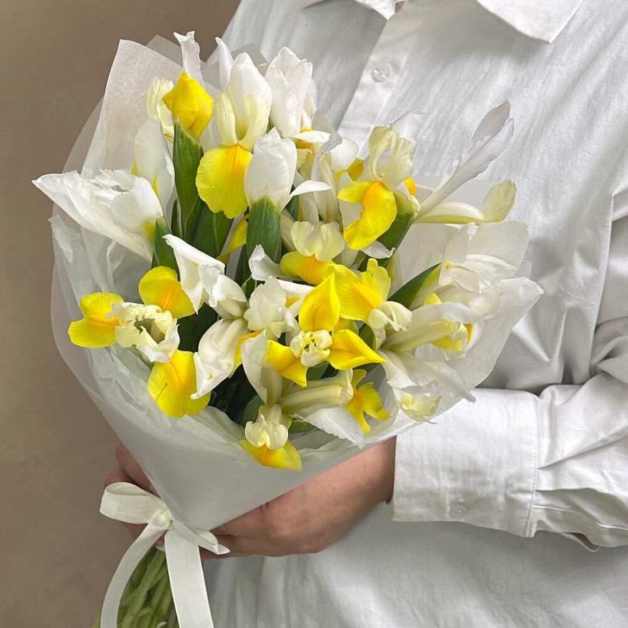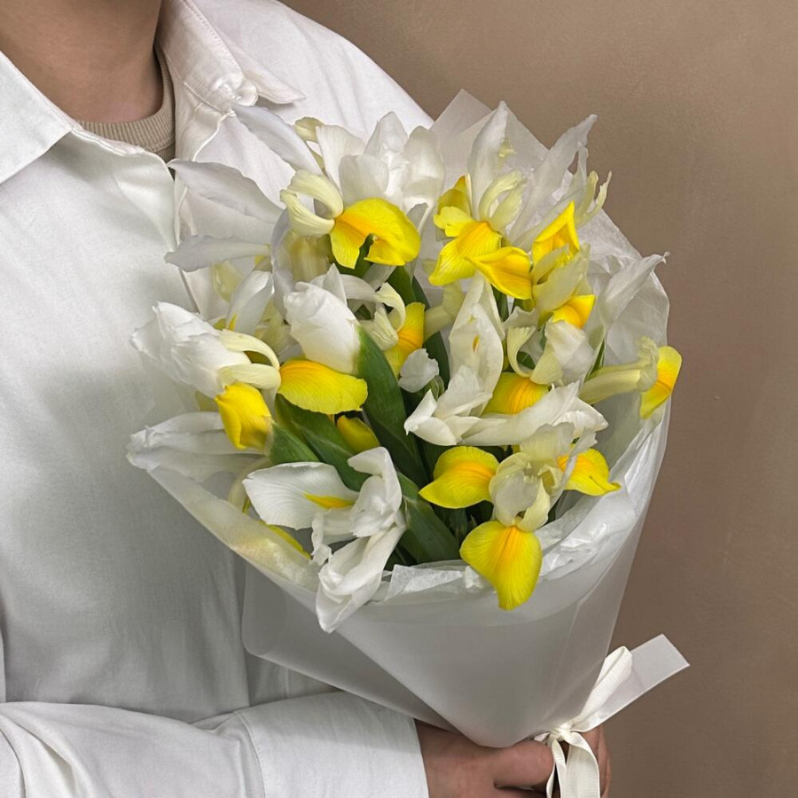 На фото букет из желтых и белых ирисов. В составе: ирис 15 шт, атласная лента 2 шт, дизайнерская упаковка 2 шт, . Все цветы свежие и ароматные, букет красиво оформлен и отлично подходит для подарка. Доступна доставка цветов или самовывоз.